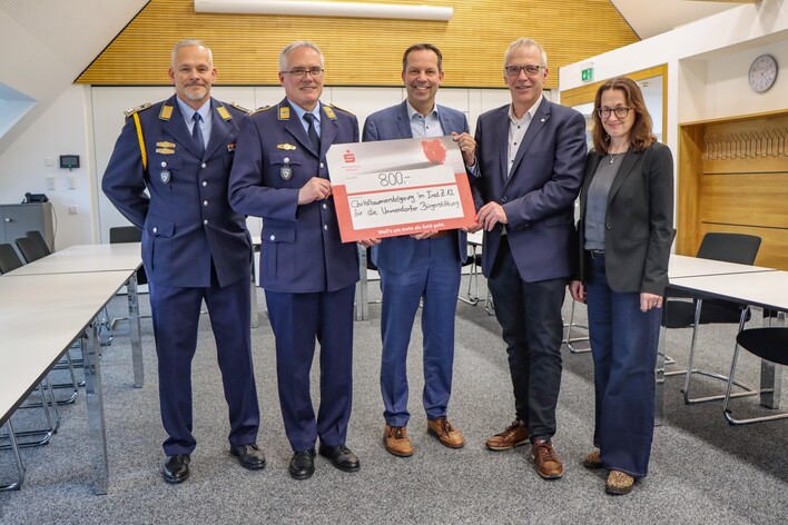Übergabe des Schecks von der Bundeswehr an die Vertreter der Ummendorfer Bürgerstiftung am 19.02.2026 im Rathaus Ummendorf [v.l.n.r: Oberstabsfeldwebel Markus Gnann, Oberstleutnant Frank Lösch, Thomas Dörflinger MdL (CDU) Stiftungsvorstand, Bürgermeister Heiko Graf, Sybille Steib (Stiftungsvorstand)].